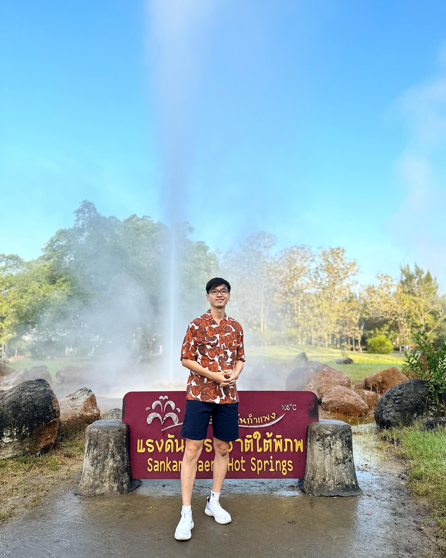 ใต้เปลือกโลกนั้นมีความร้อนสะสมอยู่ ซึ่งแถมมาด้วยก็คือความดันที่อัดแน่น เมื่อแหล่งน้ำใต้ดินผ่านไปยังบริเวณที่อัดแน่นทั้งความดันและอุณหภูมิสูงแบบนี้ .. มันก็เลย..ตู้มมมม กลายเป็นโกโก้ครันช์ ผิด! กลายเป็น “น้ำพุร้อน” 🤣🤣 ซึ่งก็มีหลายประเภทแบ่งย่อยมา ทั้งฮอทสปริง เกเซอร์ บ่อไอเดือด บ่อโคลนเดือน .. และที่พี่ฟาร์มไปเที่ยวก็คือ น้ำพุร้อนสันกำแพง จังหวัดเชียงใหม่ เป็นน้ำพุร้อนประเภทฮอทสปริงครับ .. มันฟินมากเลยนะ อากาศอุณหภูมิ 17 องศา น้ำพุอุ่นๆ ก็พ่นออกมา พอไอร้อนกระทบอากาศเย็น ก็ควบแน่นกลายเป็นหยดน้ำ หยดแปะๆ ลงมา สนุกสนาน อิอิ