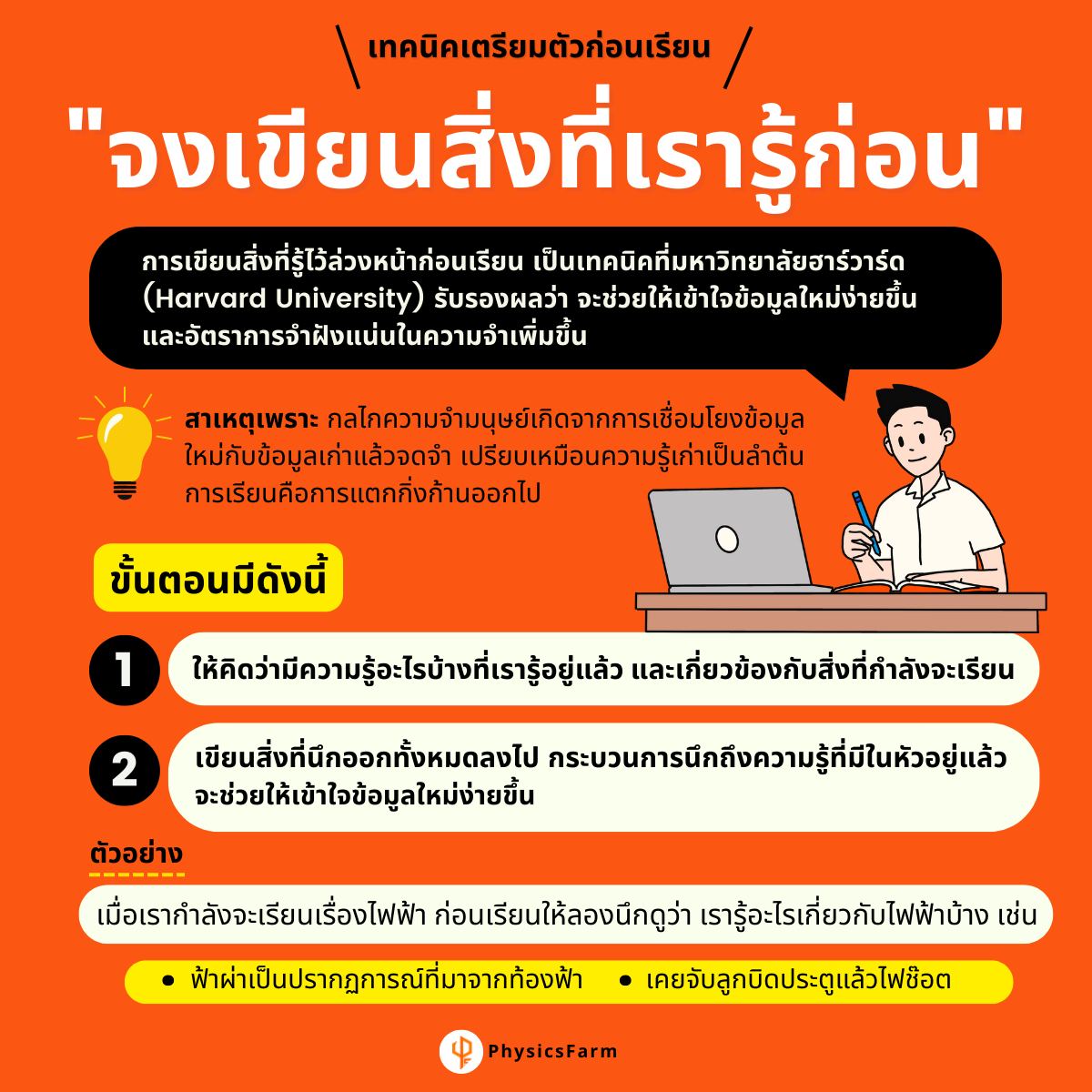 ขอแนะนำว่า ก่อนเรียน ให้ใช้เทคนิค “การเขียนสิ่งที่รู้แล้วล่วงหน้า”
